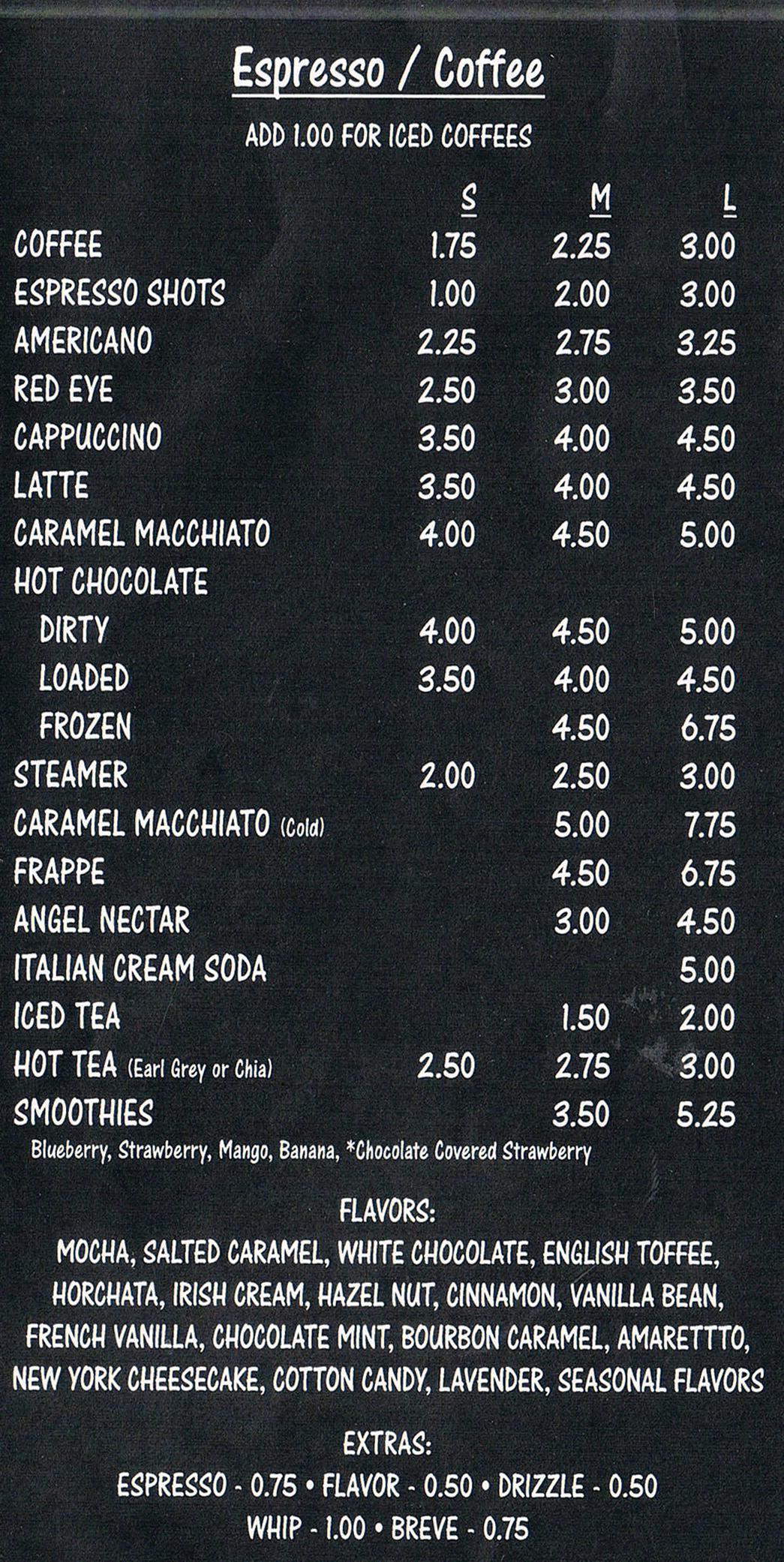 Sacred Grounds uses fresh ground beans to make a wide array of delicious beverages from our smooth Morning Blend drip coffee to our gourmet espresso drinks. You have the option of ordering a hot Latte or Cappuccino made with steamed milk and our espresso. On the other hand, mix it up with your choice of having it over ice or making it a Frappe. We will have flavors like Mocha, Caramel, and Vanilla. Other flavors will include New York Cheesecake and Salted Caramel.